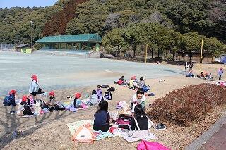 お別れ遠足は、近くの北川運動公園に出かけました。大きなグランドで鬼ごっこをしたりボール遊びをしたりしました。鬼ごっこでは、5年生が鬼になってほかの学年を追いかけていました。先生方も鬼になって子どもたちを追いかけていました。