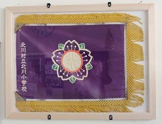 昨日(22日)、創立百周年実行委員長と大工さん(保護者の方)が来られて、校旗を新調して使わなくなった校旗を玄関に掲示していただきました。