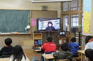 子どもたちは自分のクラスで画面越しに話を聞いていました。