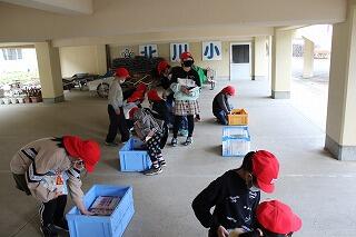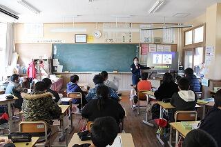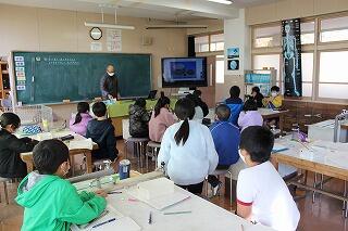 その後に、いつも献立をつくってくださる栄養教諭の先生に、給食をつくっていることに関する話や仕入れ業者の方などいろいろな方の協力で給食ができていることなどについて話をしていただきました。栄養教諭の先生は、普段は、隣の北浦小学校に勤務されています。また、魚を仕入れている北浦の業者の方の話も録音を使って聞きました。