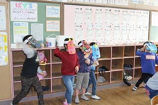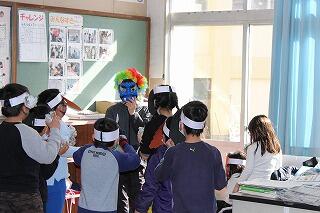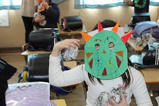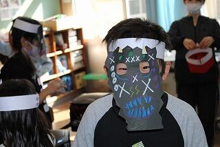 2年生の帰りの会では、鬼退治をしていました。自分で作った鬼の面をかぶりながら豆に見立てた新聞紙のボールを「鬼は外。福は内。」と小声で言いながら投げていました。途中で鬼に扮した先生鬼が出てきていました。