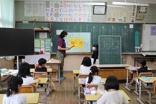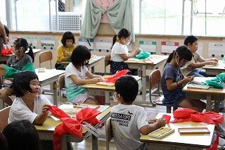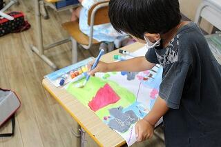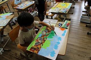 延期となったために、時間割が金曜日と入れ替えとなりました。2年生の教室では、読書感想画を描いていました。1年生は、運動会の飾りづくりをしていました。