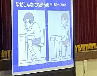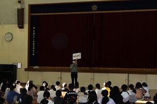次に、10月の取組について担当の先生から話がありました。月の目標は、「先生や友達の話をしっかり聞きましょう。」です。特に、「立腰(りつよう)」についての話でした。なぜ、立腰がよいのか、どうすればよい姿勢になるのかを子どもたちはしっかりと聞いていました。