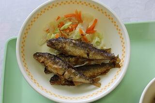 今日の鮎は、北川のきれいな水で育てられた稚アユだそうです。丸ごと食べられるように調理されていますが、半分ぐらいの子どもは頭をとって食べていたようでした。