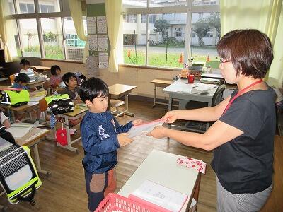 1年生は入学して初めての通知表です。担任の先生が、1年生としての1年間の半分が終わったことを説明した上で、一人一人に通知表を渡しました。子どもたちはとても緊張していたようです。