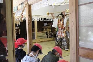 神社に着くと、川坂神楽の保存会の方が待っていてくださいました。まず、川坂神楽について説明をしていただき、実際に神楽を舞ってもらいました。その後に、質問をしたり、道具を間近で見せてもらったりしました。
