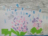 折り紙をちぎってあじさいを表現し、クレヨンで雨や生き物を表しています。雷を描いている作品もあります。一人一人の個性が表れていて、ずっと見ていたい気持ちになりました。素晴らしい感性を大事にして欲しいと思います。