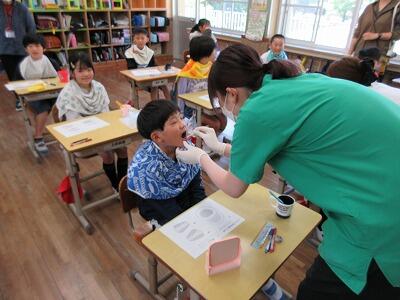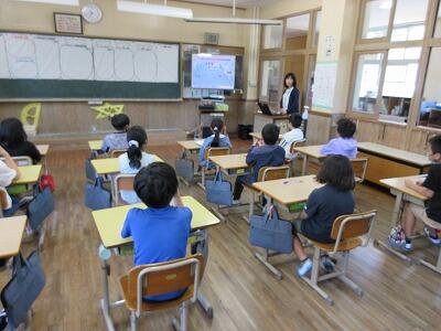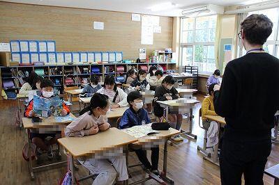 延岡市ALTのアンソニー先生と一緒に楽しく学習をしています。5年生の教室では、英語であいさつをしたり授業で使う英語を覚えたりしていました。ALTの先生と一緒にゲームをする場面では、たくさんの笑顔が見られました。