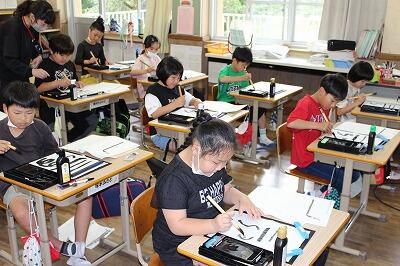 最初に、道具の準備や片付けの方法を教えてもらいました。ほとんどの子が初めてなので、筆に墨をつけるまでに1時間かかりました。