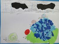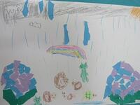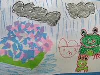 折り紙をちぎってあじさいを表現し、クレヨンで雨や生き物を表しています。雷を描いている作品もあります。一人一人の個性が表れていて、ずっと見ていたい気持ちになりました。素晴らしい感性を大事にして欲しいと思います。