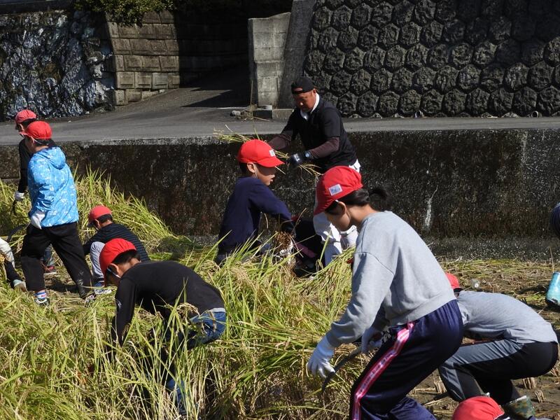10月9日(火)毎年行っています稲刈り体験を今年も5年生が行いました。PTA会長さんの田んぼをお借りしてできたお米は、まさに黄金色になっていました。台風の心配がありましたが、体験できて良かったです。JA北川の青年部の皆様にはいつもお世話になります。働いたあとのおにぎりやジュースはとてもとてもおいしかったです。
