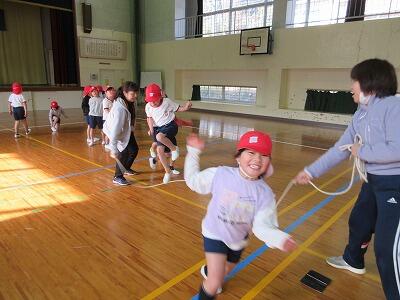 2月3日の体育では、長縄を使った八の字跳びを練習していました。3分間で何回跳べるかに挑戦し、約80回を跳ぶことができました。これまでに100回跳べたこともあったそうです。