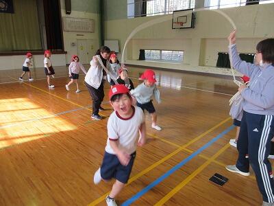 自分の得意な跳び方を披露したり長縄にチャレンジしたりしました。6年生の素晴らしい跳び方に、3年生が「すごい」と驚いていました。「おにいちゃんがんばれ!」というほほえましい応援の声もありました。ALTのアニカ先生も参加してくださいました。