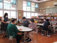 次の写真は、「子どもたちが本を好きになるためにはどうしたらよいか」「にじいろ図書室はどんな活用ができるか」について話し合っている様子です。