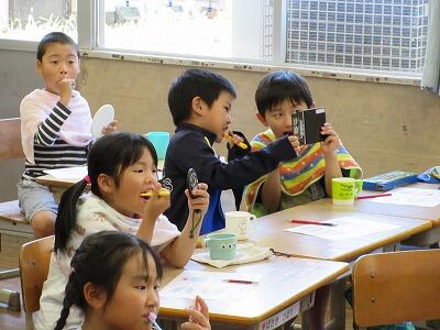 登校前に歯みがきをしてきた子どもたちでしたが、広い範囲がピンクに染まったことに驚いた様子でした。きっと、しっかりとした歯みがきが身に付いたことでしょう。