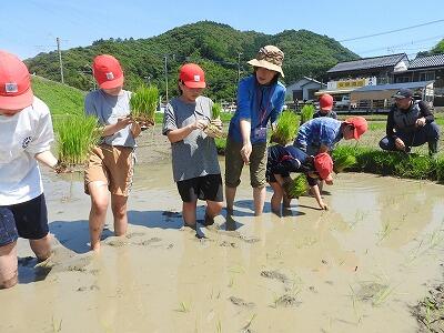 6月19日(水)、川坂地区の田んぼで田植えをしました(梅雨とは思えない晴天でした)。