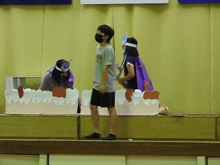 むし歯のもとになるミュータンス菌と歯磨きとの様子を劇にして、むし歯にならないように気をつけるように呼び掛けていました。