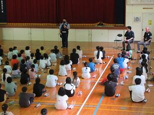 体育館では、北川駐在所や延岡警察署の方のお話を聞きました。
