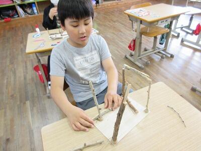 4年生が自然の材料を使った工作をしていました。材料は校内で集めたそうです。