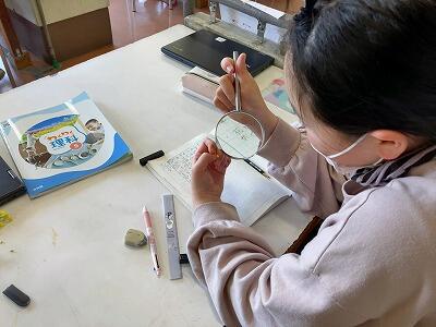 5年生が理科の学習でアブラナの観察をしていました。「花のつくり」という学習で、アブラナの花を細かく観察します。ピンセットで花を分解し、虫めがねで調べていました。春にぴったりの学習です。