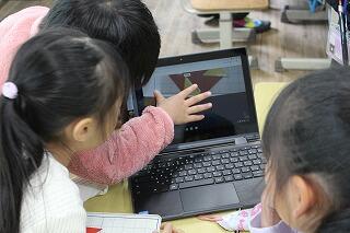 1年生の3時間目は、算数でした。三角形の色板を使って、形作りをしていました。自分がどんな形を作ったか、みんながどんな形を作ったかをお互いに確かめるためにパソコンで写真を撮っていました。