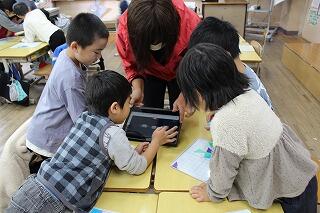 1年生の3時間目は、算数でした。三角形の色板を使って、形作りをしていました。自分がどんな形を作ったか、みんながどんな形を作ったかをお互いに確かめるためにパソコンで写真を撮っていました。