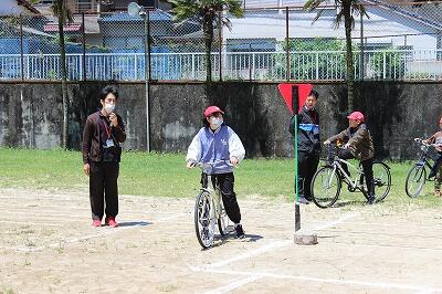 3年生以上は、自転車の乗り方と横断歩道の渡り方を中心に学習しました。指導は延陵自動車学校の指導員の皆様です。