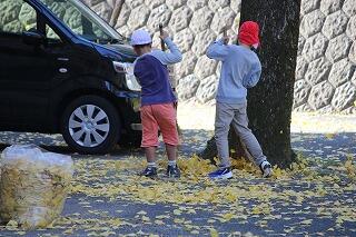 真冬が近づいています。校舎裏の駐車場では、いちょうが色づき、たくさんの葉が落ちています。そうじが、大変です。特別に外のそうじの人数を増やして、ほうきで掃いています。しばらく、葉っぱ集めが大変です。