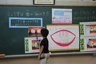 2年生の教室では、歯の図や模型を使って上手な歯のみがき方について学んでいました。