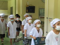 給食当番は、静かに並んで歩きます。食べ物を運びますので、安全に丁寧に、そして、感謝の気持ちをもって活動しています。給食当番の移動は、落ち着いてできるようになりました。