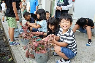 2年生は、2校時に芋ほりを行いました。芋畑は、学級の前にあります。大きなお芋ができていて、バケツに7杯分とれました。
