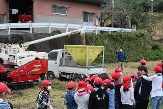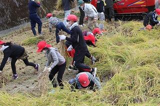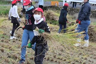 5年生は、稲刈りを2・3校時に行いました。学校から少し離れたところに田んぼを借りています。雨が降りそうな予報でしたので、作業時間を早めるために半分は事前に機械で刈っておいていただきました。そのため、半分の時間で稲刈りが終わりました。楽しそうに稲刈りを体験していました。稲を刈っていると多くのかえるや野ネズミがでてきて、小騒動になっていました。