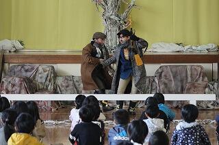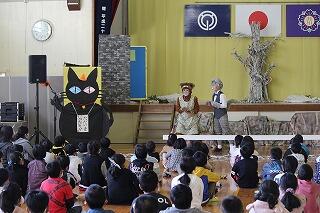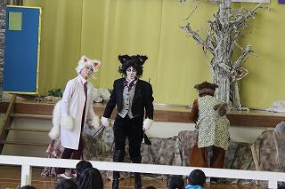 「注文の多い料理店」を演じていただきました。歌にダンスに子どもたちは一生懸命、みていました。途中、怖くなったり悲しくなったりして涙ぐんでしまう1年生もいたようでした。芸術の秋を感じることのできた時間となりました。