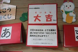 まず、くじを引いて、そのくじに書かれてあるひらがなを確かめた後、掲示してあるひらがなの所を開くと大吉や中吉が出てきます。そして、健康になるためにどうすればよいか書いてあります。子どもたちは、楽しそうにおみくじを開いていました。