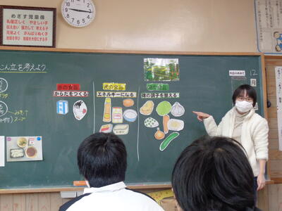 12月7日(木)、6年生の家庭科の授業に、北浦小学校栄養教諭の関口直子先生に来ていただいて、栄養や栄養バランスのとれた献立づくりについて学習しました。