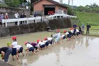5年生は、2校時から4校時にかけて、田植えを行いました。田植えをする場所は、前PTA会長さんの田んぼです。JA延岡青年部の方々に協力していただきました。はじめは、慣れずに時間がかかったりたくさんの苗を植えてしまったりしましたが、最後になると上手に植えることができていました。