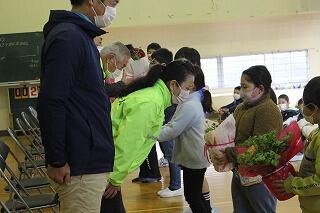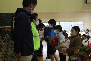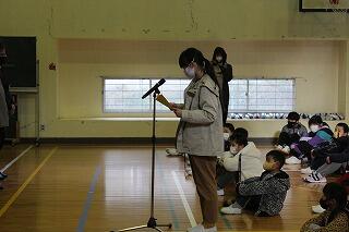 感謝集会では、まず、ボランティアの方から話をしていただきました。次に、児童代表で6年生に感謝の言葉を述べてもらいました。校歌のプレゼントをして、最後にお花を贈りました。