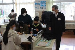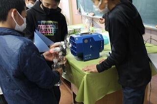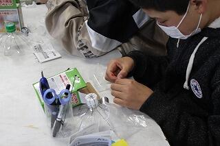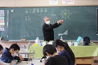 今日の5・6時間目の6年生は、理科の授業でした。理科は、野口遵顕彰会から講師を招いて、風力発電について創作活動を通して学びました。ペットボトルで羽根をつくり、モーターに付けました。さらにモーターにLEDを付け簡易な風力発電装置ができました。その後、送風機を使って、電力ができるか確かめました。