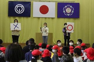 はじめのことばのあとに全校遊びをしました。「落ちた。落ちた」ゲームや全校クイズをしました。