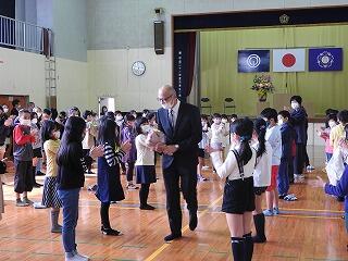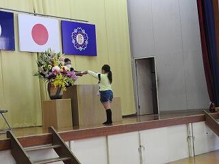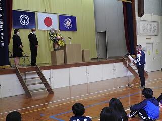 はじめに、学年ごとに代表の児童に修了証を渡しました。修了証を代表者がもらうときは起立して同じ動きをしました。