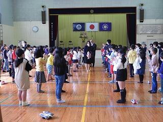 今日は、体育館で北川小学校を転任される先生のお別れの式がありました。