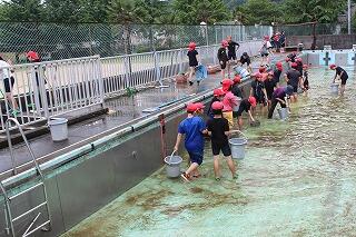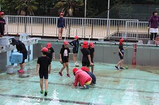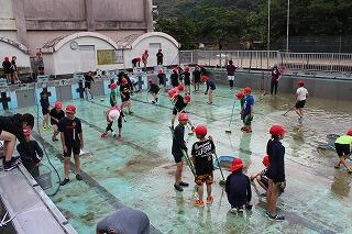 5・6時間目にプール掃除をしました。4年生以上が参加しました。2年ぶりのプール掃除でした。小プールは水が抜けてブラシで掃除ができましたが、大プールは水が抜けていなかったためにバケツで水をかきだす作業をまず行いました。その後、水がなくなった床やプールサイドブラシで磨きました。