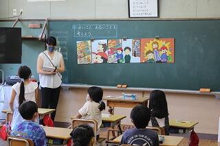 内容は、万引きについてでした。万引きをするとどうなるかを学んだり、どうすればよかったかなどかみしばいや絵をとおして学びました。子どもたちは、一生懸命考えていました。