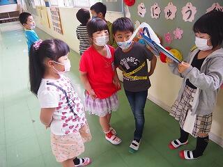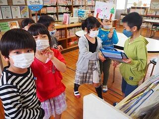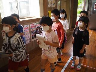 4月27日(水)に、1・2年生の生活科の学習で「学校探検」を行いました。5つのグループに分かれ、グループの旗をもった2年生が1年生を引き連れて校内を探検しました。図書室や保健室、音楽室などいろいろな教室を紹介しました。2年生が1年生にクイズをだして楽しく仲良く活動しました。