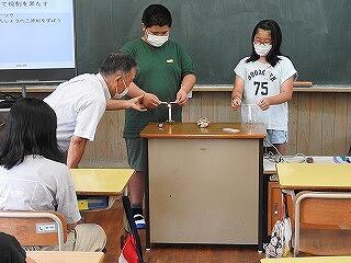10円玉をのせた紙に火をつけても破れない実験や、箱の周りをぐるぐる回るロボットを見て、子どもたちは「なぜだろう?」と不思議に思っていました。疑問を持つことが大切!と教えていただきました。その後、延岡市や日本が世界に誇ることができる、ものづくりの技術についてお話をしていただきました。他にも、鉄鉱石やレーヨン(布)に触れるなど、貴重な体験をすることができました。