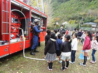 ①については、校舎内で火事が発生したと想定して、各教室から運動場へ避難しました。「おはしも」を守って行動しました。全員が無事に避難したことを確認した後、消防署の方に、実際に火事が起きた時どのように動くべきか教えていただきました。②については、消火器操作を6年生代表2名が体験しました。その後、消防車を使って実際の放水の様子を見学させてもらい、消防車に備え付けられているものなどについても詳しく話をしていただきました。初めて近くで消防車の設備などを見た児童もいて、興味津々の様子でした。