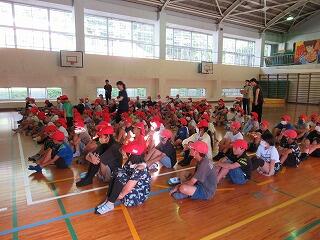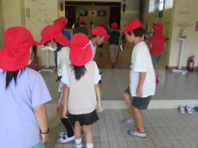 その後、揺れが収まったという想定で、体育館へ(本来は運動場ですが、天候の影響で運動場の状態が悪かったため、体育館となりました)と避難するように指示があり、担任の誘導で整然と移動しました。