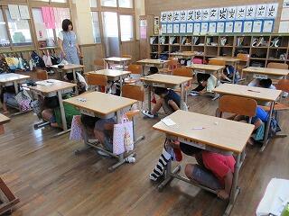 放送で緊急地震速報の音が流れるとすぐに担任の指示で一次避難(机の下にもぐって頭部を守る)しました。