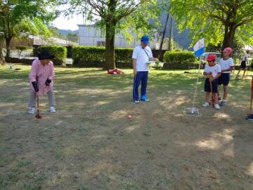 屋外スポーツクラブの児童と熊田グランウドゴルフ愛好会の方と一緒にグラウンドゴルフを行いました。