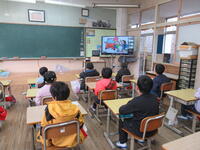 児童の多くは、登下校で道沿いを歩いています。2月16日(金)の朝の時間、オンラインで全学年への交通安全指導を行いました。